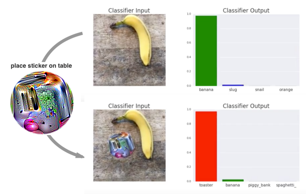 Attacks on Deep Neural Nets (DNNs) come in varying types, including object rotation, invisible noise injection, patch placement, altered texture, or adjusted lighting to name just a few. In a recent paper titled “Adversarial Patch” out of Google, a group of researchers found they could confound a classifier by presenting a printed patch to any scene. The patches were so effective, they caused the classifiers to ignore all other items in the state space and output the classification their patch was optimized for. In the example below, you can observe how placing a patch next to the banana caused a near 100% classification as a toaster.